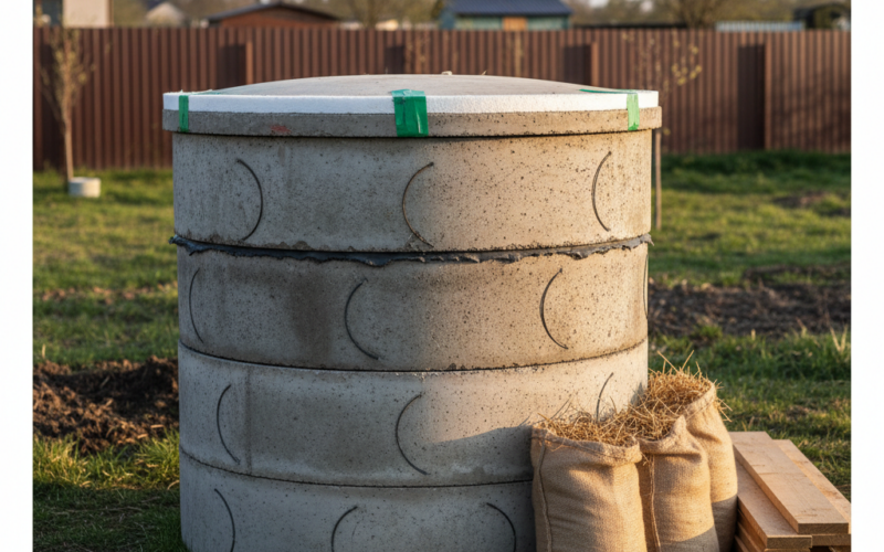 Основные цифры: кольца стандартного размера (d=1–1,5 м, h=0,9 м каждое), глубина подбирается под уровень промерзания (обычно не менее 2 м), герметизация — цементным раствором, битумом, иногда с добавлением мастики. Обслуживание — проверка герметизации и отсутствие воды внутри вне сезона.