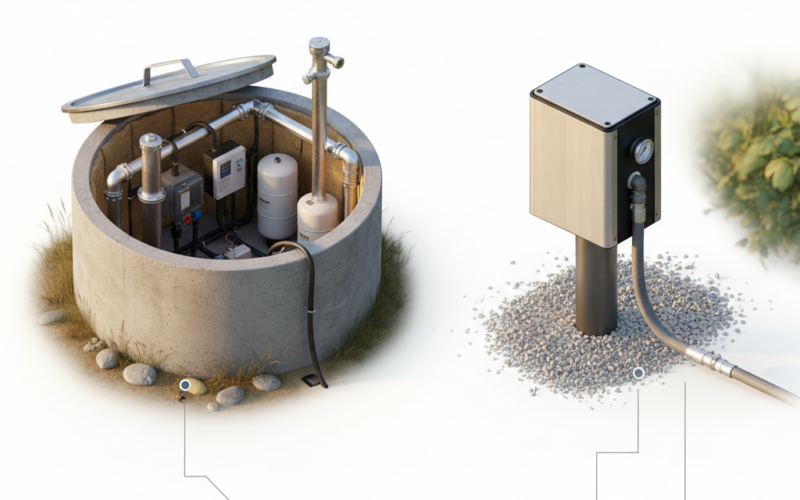 Кессон позволяет поставить гидроаккумулятор и управление прямо на участке — освободите место в доме (актуально для небольших строений). С адаптером весь «движ» переезжает в дом: котельная/хозблок — требуется отдельное место, и проконтролировать протечки/шум проще.